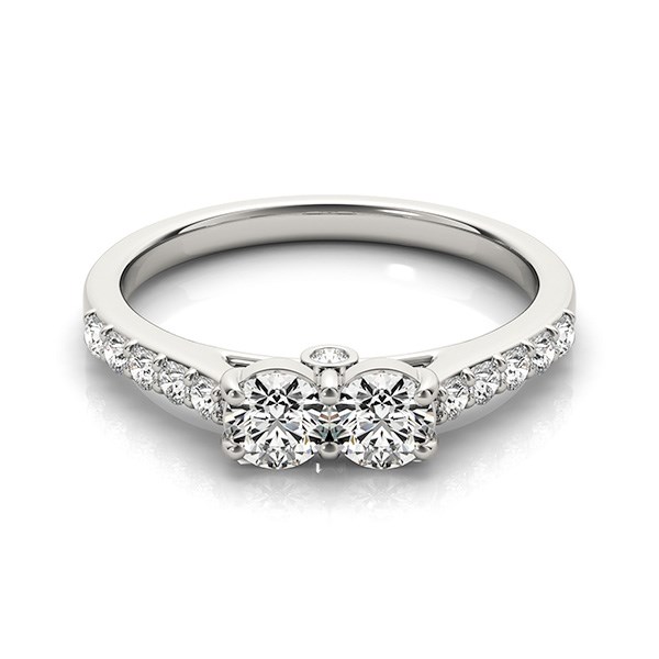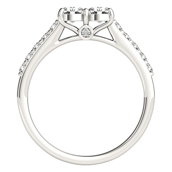 A study in sophisticated style, this two stone side by side diamond ring is perfect to symbolize your special union together. Two additional side profile bezel set diamonds sets this ring apart. Crafted in fine 14k white gold.