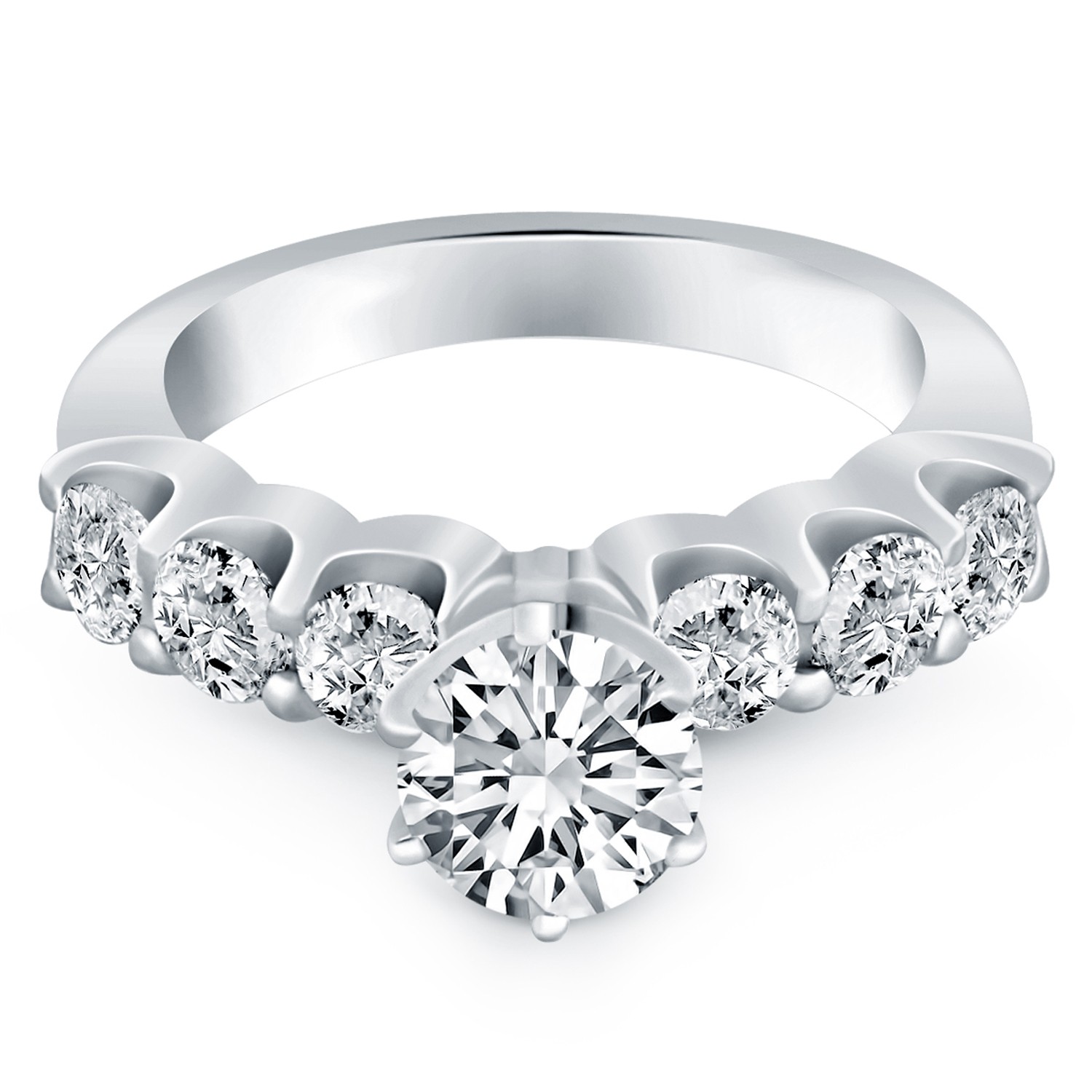 Six glittering accent diamonds in shared prong settings dazzle along the front of this stylish engagement ring mounting. Expertly crafted in 14k white gold, the center setting can be customized to accept a wide range of center stone sizes and shapes. The center highlights a sparkling 1/2 carat round cut diamond.