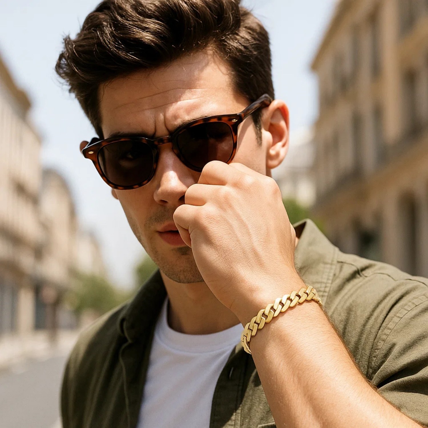 This Modern Lite Edge bracelet is beautifully crafted in 14k yellow gold with a high polish finish and closes with a box clasp. Measuring 8.0 mm in width and available in 8 1/4 inches in length.