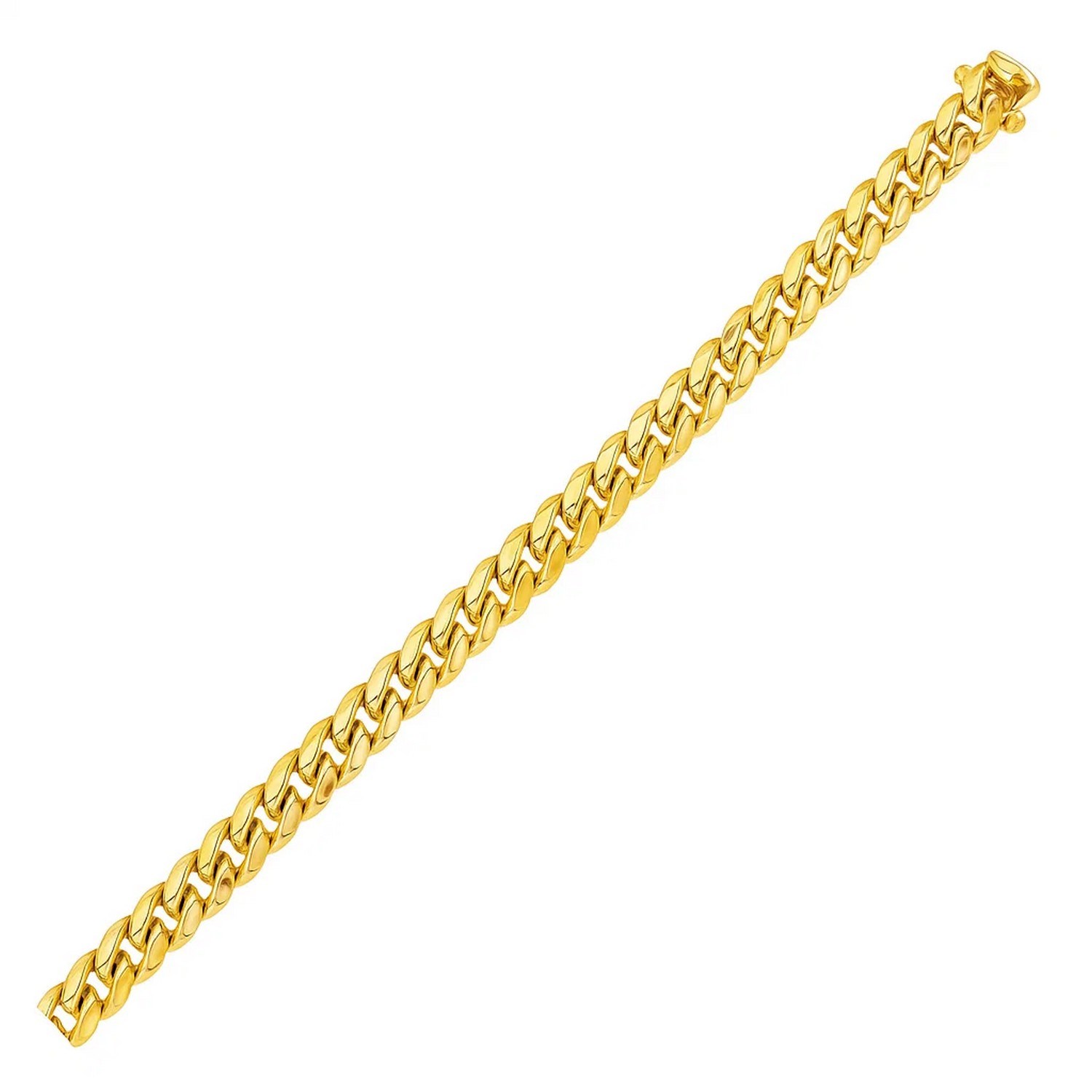 This semi solid Miami Cuban bracelet comes in 14k yellow gold and has a width of 6.1 millimeters. Secured with a box clasp.