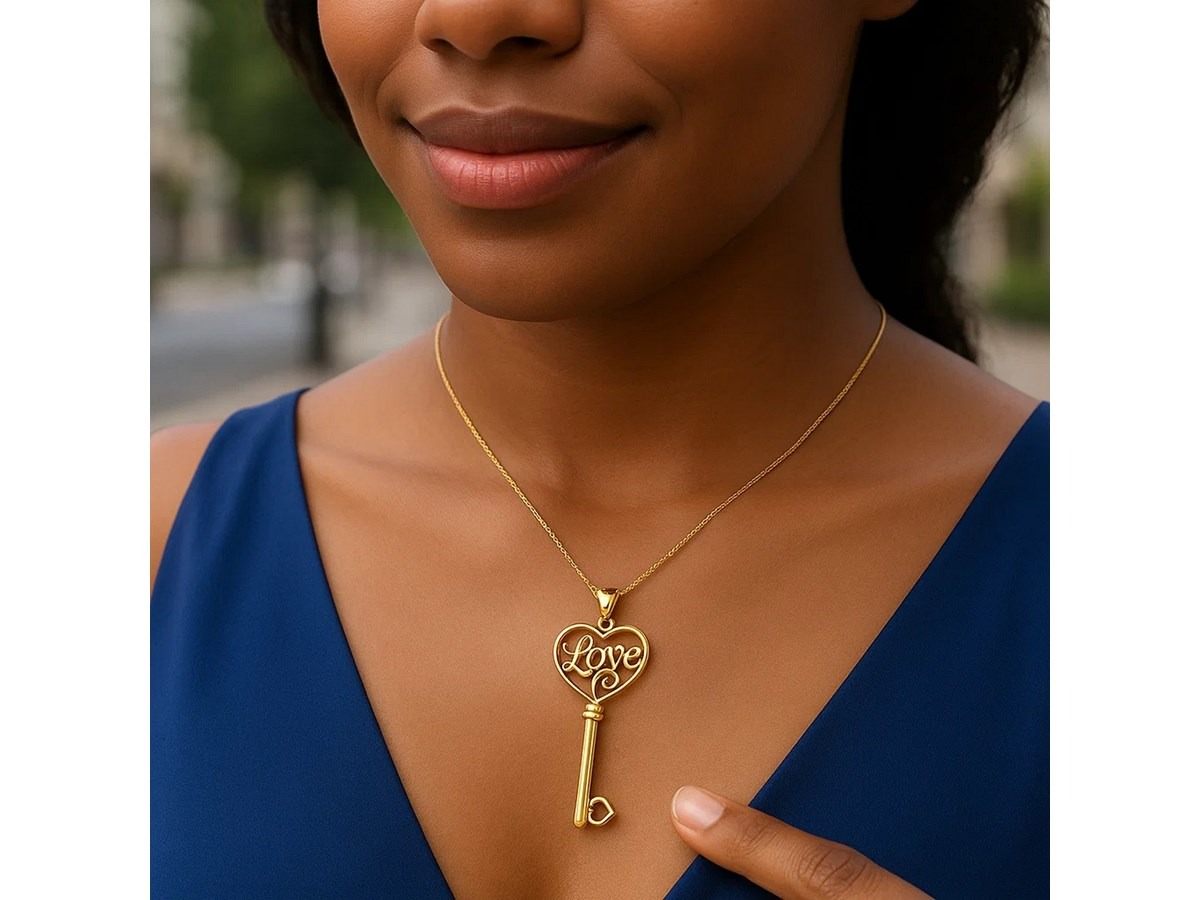 Stunningly adorable, this classic skeleton key style pendant showcases an exquisite LOVE design. Made of 14k yellow gold, this beauty boasts of heart shape detailing.