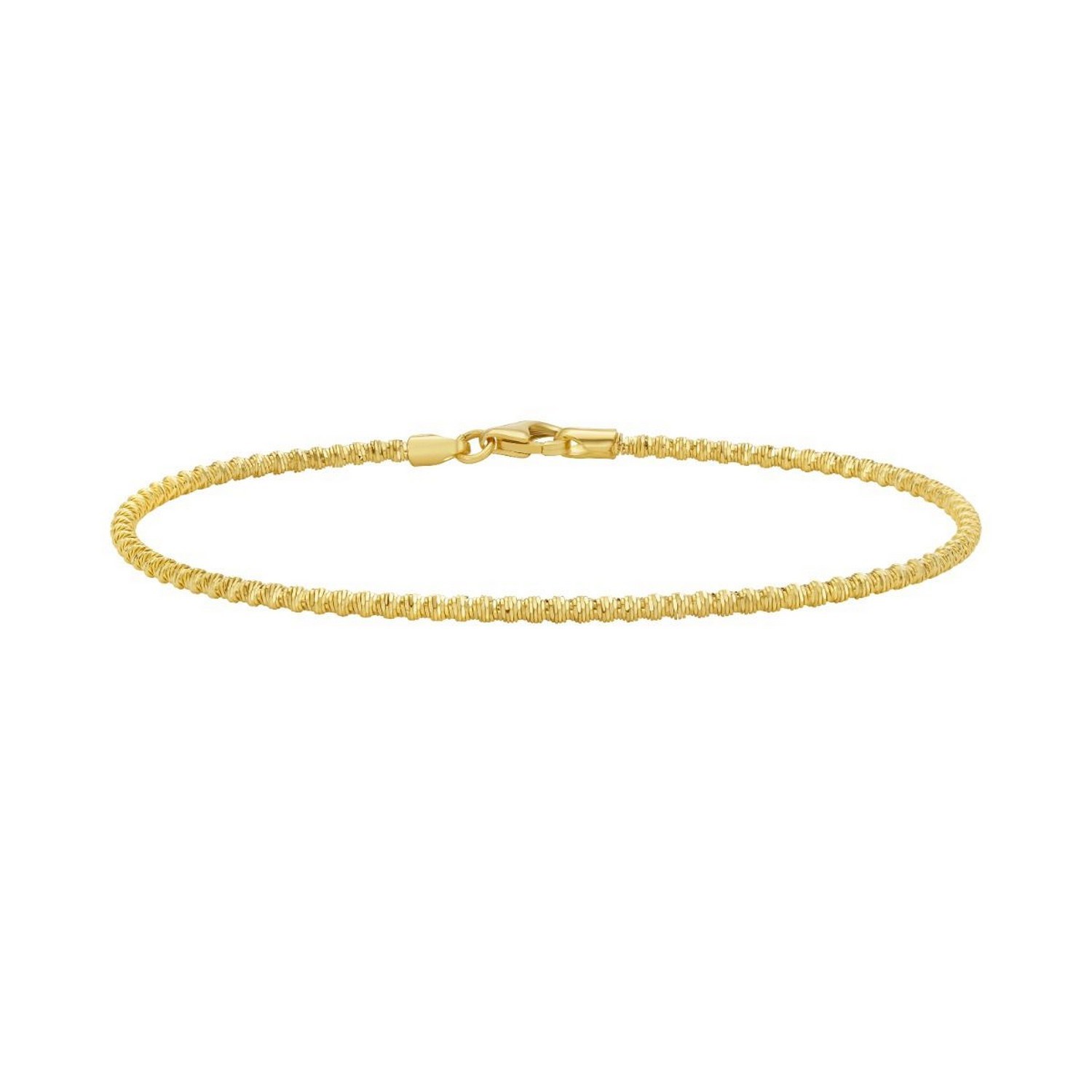 Enhance your jewelry collection with this exquisite 14K yellow gold bracelet, featuring a 2.10 mm sparkle spring chain design. The intricate craftsmanship ensures a brilliant shine, making it a versatile accessory suitable for both everyday wear and special occasions. Measuring 7 inches in length, it offers a comfortable fit secured by a lobster clasp. This timeless piece adds a touch of elegance to any ensemble.