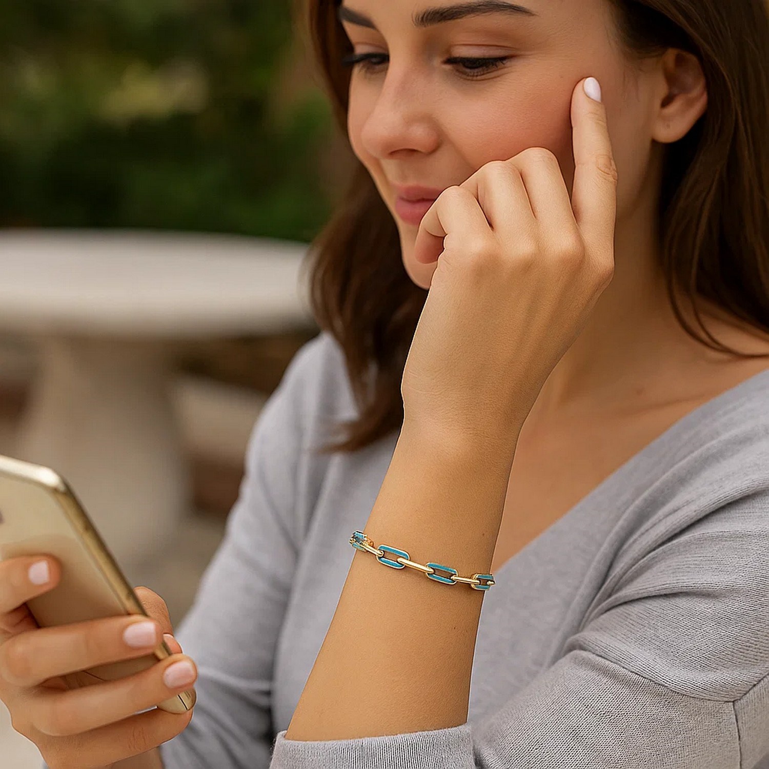 An exquisite 14k yellow gold paperclip gem link bracelet, highlighting a blend of gold and turquoise links in a contemporary style. Bracelet is 7 1/2 inches long and secured with lobster clasp.