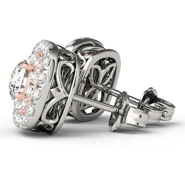 Cushion Shape Halo Diamond Earrings 14k White and Rose Gold