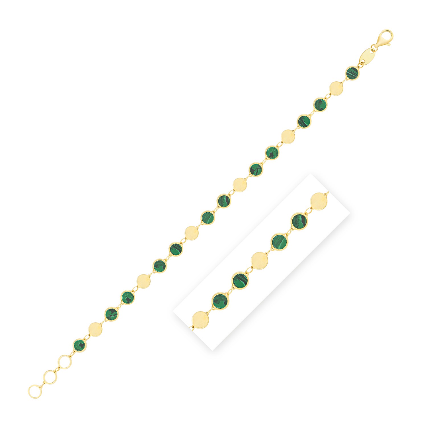 Crafted with elegance, this bracelet features lustrous 14k yellow gold discs alternating with deep green malachite discs. Each element is thoughtfully arranged to showcase its individual beauty and collective harmony. A sophisticated pear-shaped lobster clasp, coupled with a 0.75 inches extender, ensures both a secure fit and adjustable length. This piece is a vibrant celebration of color and style, perfect for elevating any wardrobe.