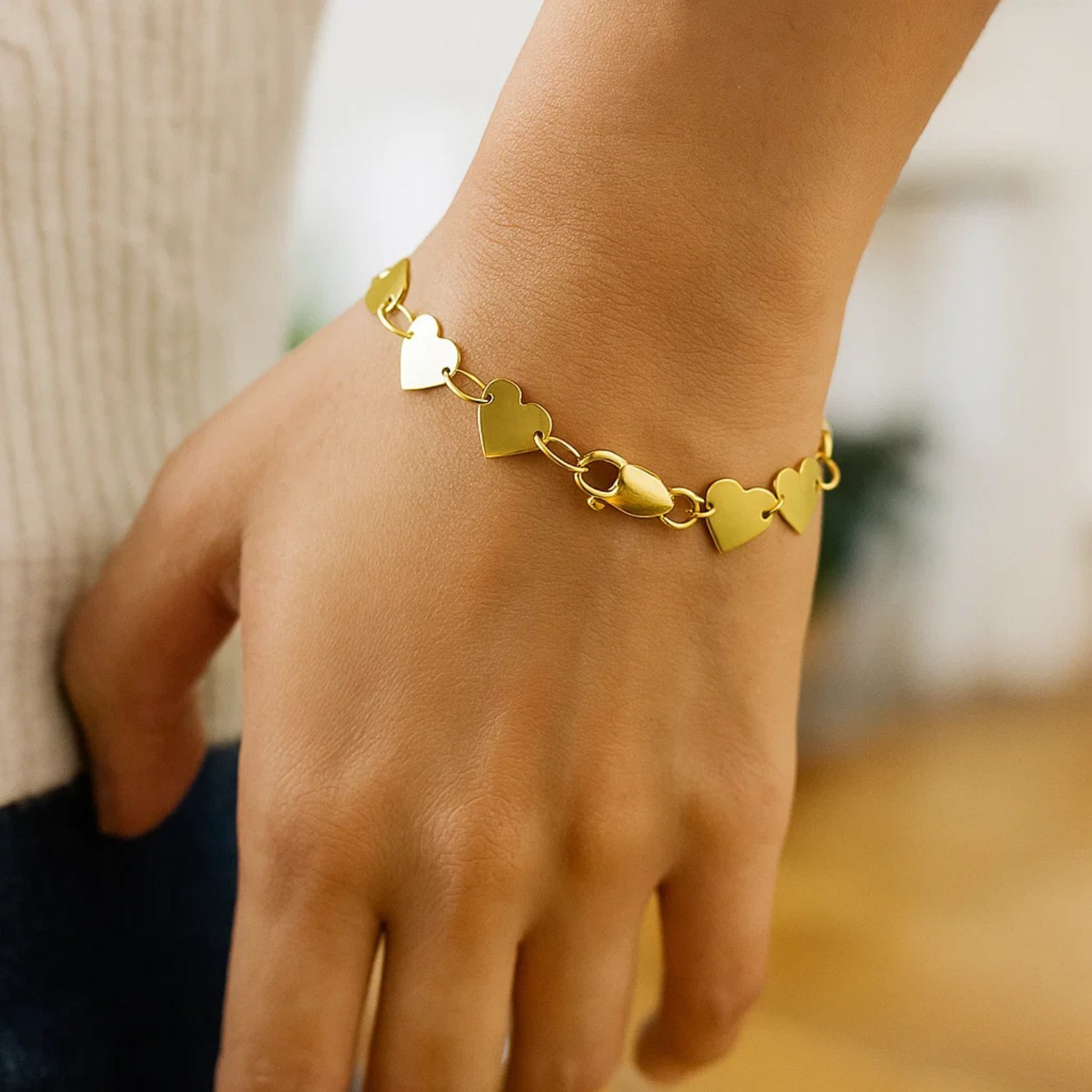 Delicate hearts shine as they dance gracefully along this finely crafted 7 1/4 inches chain bracelet, capturing the light with every movement and casting playful reflections. This 10k yellow gold piece stands as a testament to love and exquisite artistry, making it an ideal gift for someone special or a treasured addition to your collection. Each heart mirrors inner beauty and elegance, embodying timeless charm and grace.