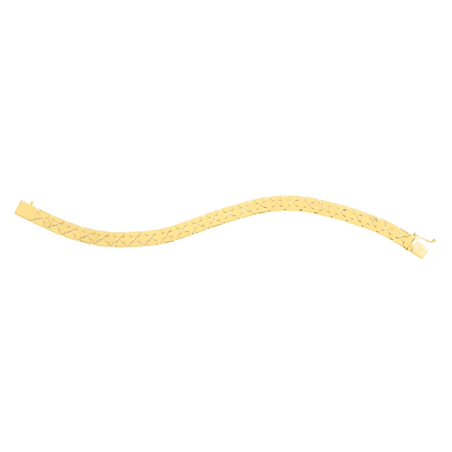 Capture the essence of nature with this exquisite 14k yellow gold bracelet. Measuring 7 inches, its organically inspired motif evokes the natural beauty of flora, accented by delicate hints reminiscent of a four-leaf clover gracefully gracing your wrist. The polished finish enhances its feminine allure, while its generous width commands attention, making it a captivating symbol of natural elegance.