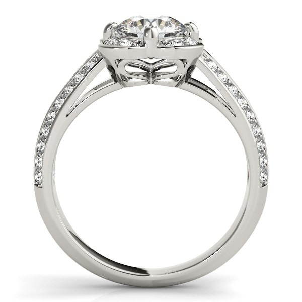 Exuding, stylish elegance this round cut diamond engagement ring showcases a flower-like pave set border detailing and an eye-catching weave motif, diamond split shank truly gorgeous made of 14k polished white gold.