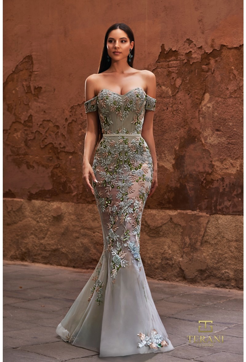 The structured silhouette flatters the figure while offering a timeless, red-carpet–inspired presence. Crafted with Terani Couture’s signature attention to detail, this gown balances glamour and sophistication—perfect for prom, black-tie events, galas, or formal celebrations.